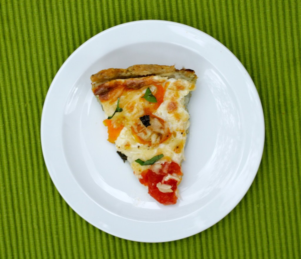 The crust on this tart is made with basil and garlic and the flavor is incredible. The tart is then topped with lots of yummy cheese and tomatoes, then baked until the cheese is bubbly. It’s like a pizza, but better. If you so desire, you can top it with some crumbled sausage or bacon. We like both, but we especially love the bacon! Enjoy.